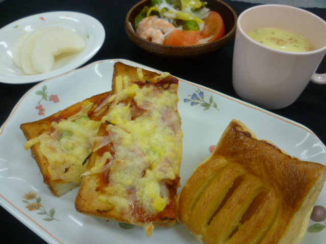 ピザトーストとスイートポテトパイを焼き立てでお出ししました