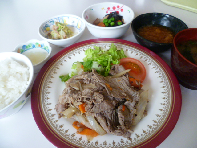 本日は静岡産の牛モモ肉とアスパラ・玉ねぎ・人参・舞茸を醤油ベースの甘辛タレで炒めました。