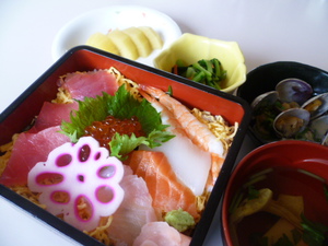 本日はマグロ・カツオ・サーモン・鯛・文甲イカ・海老・イクラと海鮮物をふんだんに盛り付けた散らし寿司です。