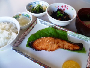 本日は鰆を西京味噌に漬け込み香ばしく上品な味に焼き上げ、出汁の利いた出し巻玉子を添えました。
