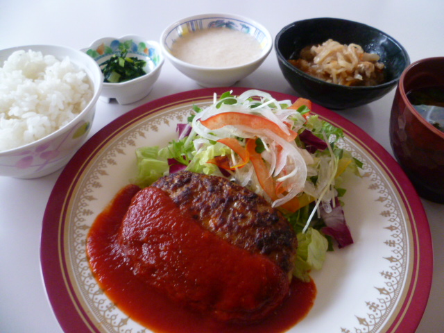 本日は黒胡椒を少し利かせた牛肉100%のジューシーなハンバーグです。