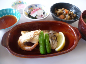 本日は、<全国食べ歩きメニュー:兵庫〉新鮮な桜鯛と海老の宝楽焼きをご用意いたしました。