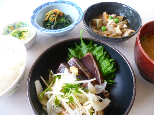 本日の夕食は旬のカツオのたたきに玉葱、茗荷、カイワレ、葱、生姜の香味野菜をのせてポン酢で召し上がっていただきます。