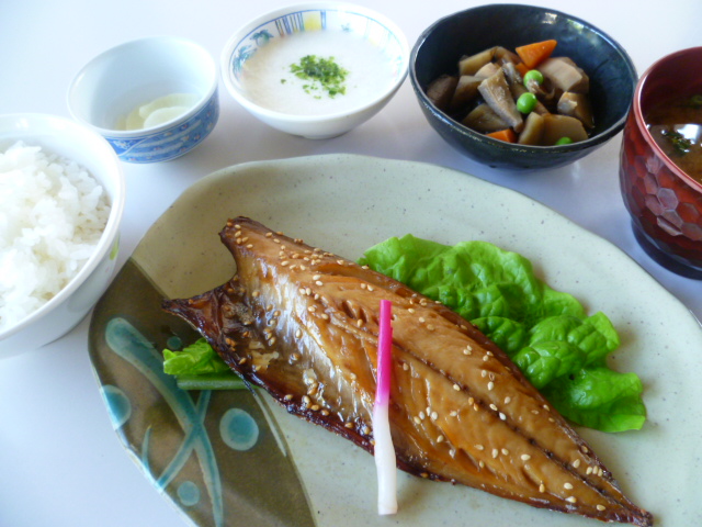 本日の夕食は旬の長崎産の大ぶりな鯵の塩焼きです。