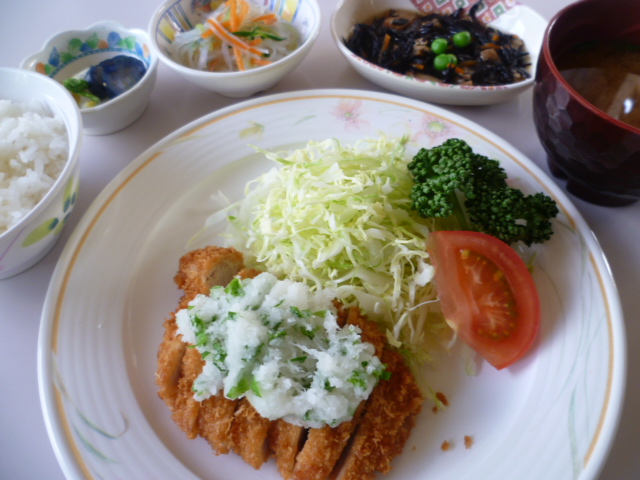 本日の夕食はサクッとジューシーな豚カツの上に大葉入りの大根おろしをのせ、さっぱりと召し上がっていただきます。