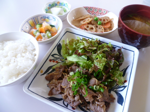 本日の夕食は静岡産の柔らかい牛モモ肉を野菜とサッと炒め、さっぱりとおろしポン酢をかけて召し上がっていただきます。。
