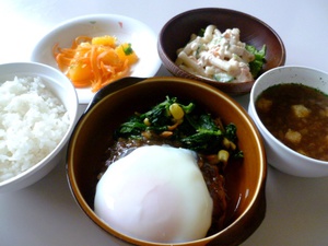 ・半熟卵のせ チーズハンバーグ ほうれん草のソテー添え