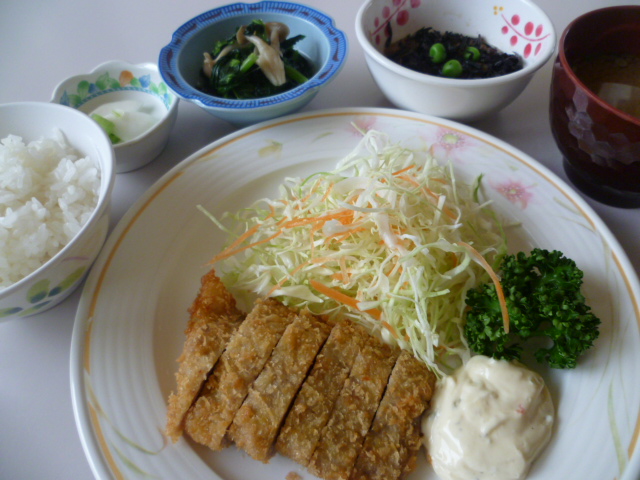 本日の夕食はクリームチーズ、生クリーム、ピクルス、レモン汁で作ったさわやかなチーズソースで召し上がっていただくロース豚カツです。