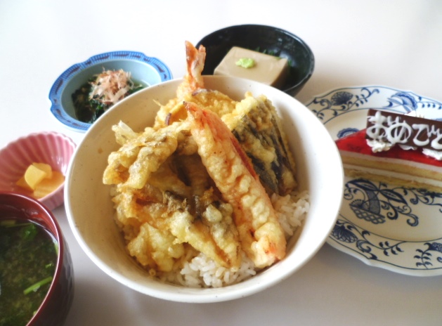 揚げたての海老と野菜の天丼と、誕生月の方にはケーキを添えました。
