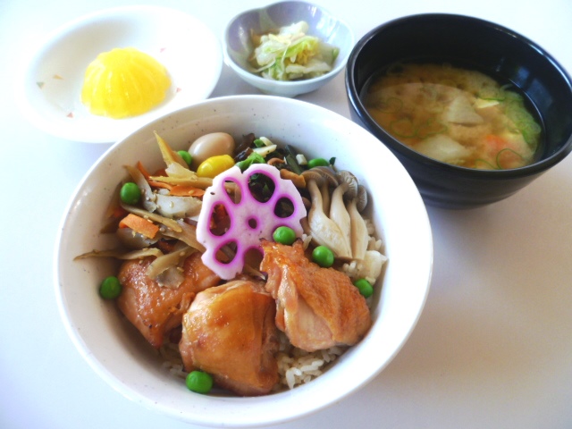 山の日にちなんで、鶏肉、山菜、しめじ、牛蒡、銀杏など