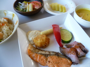 本日の夕食は特別食でローストビーフ、サーモンのソテー、帆立のフライに夏野菜のグリルを添えました。