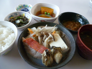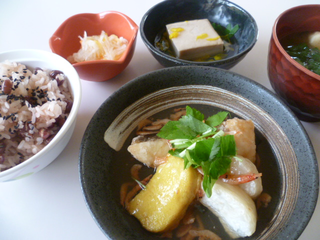 本日の夕食はふろふき大根に金目鯛をのせて蒸し上げ、生海苔と菊花の入った銀餡をかけて召し上がっていただきます。