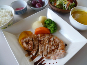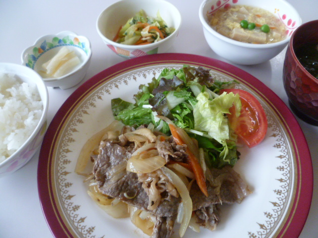 本日の夕食は静岡産の牛モモ肉を野菜と一緒にもろみ醤油で香り良く炒めました。