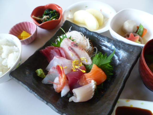 本日の夕食は鮪、鰤、鯛、鰹、サーモン、甘海老、炙り鰆の新鮮なお造り七種盛りです。