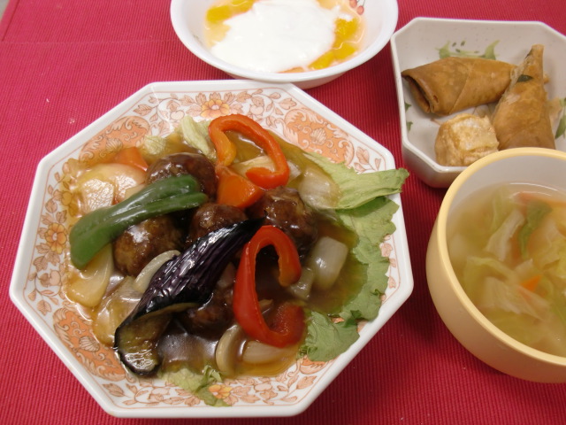 米茄子、鶏肉、帆立、海老をオイスターソースで召し上がって戴きました。悪天候で食堂にいらっしゃれない方へはお弁当箱でお届けしました。