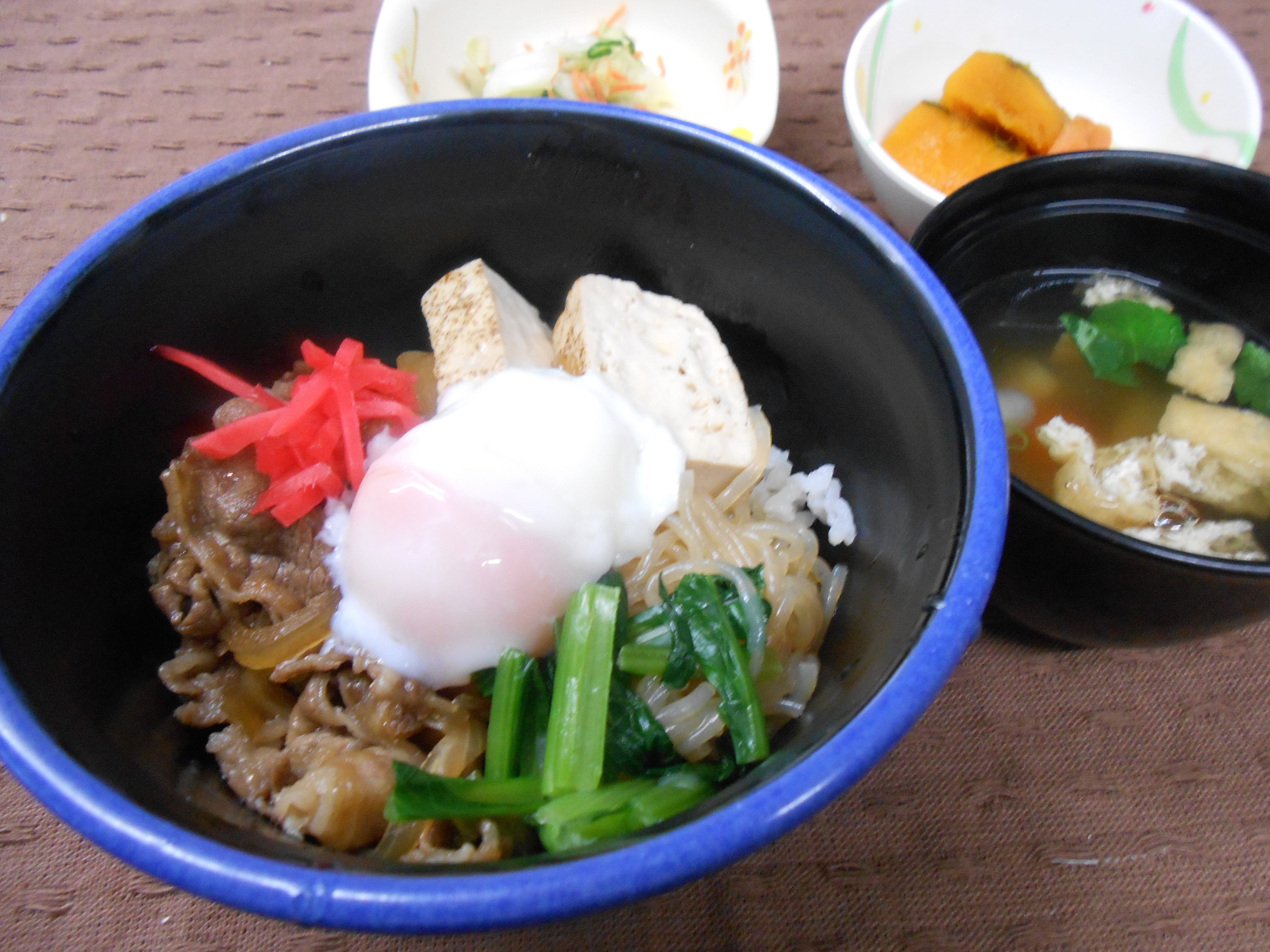 今日の昼食はすき焼き丼温泉卵ぞえでした。