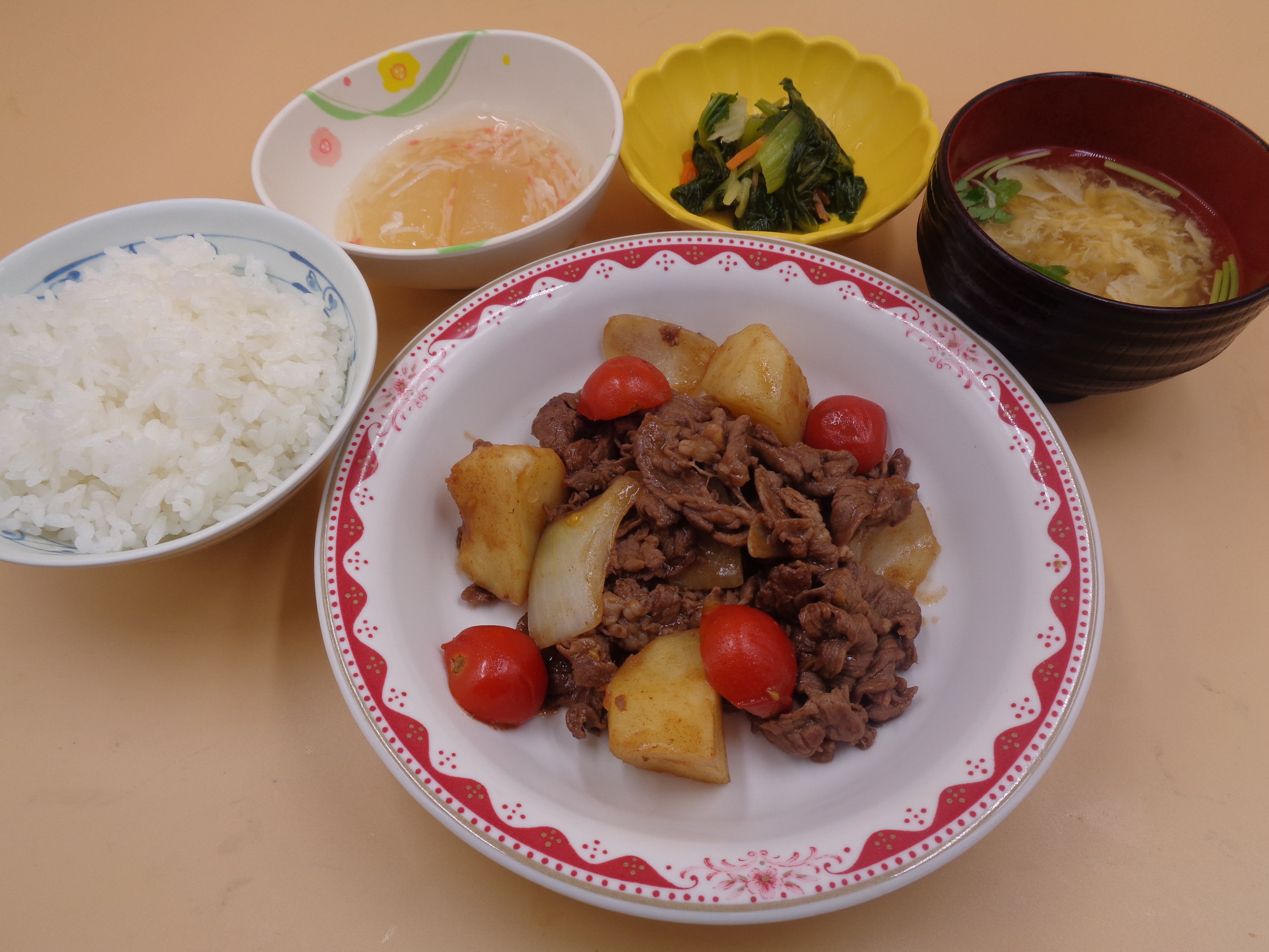 本日の夕食はたっぷりの牛肉をトマトの酸味でアクセントを加えた