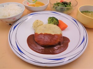本日の夕食は、見た目もきれいなチーズハンバーグを特製のデミグラスソースで提供いたしました。