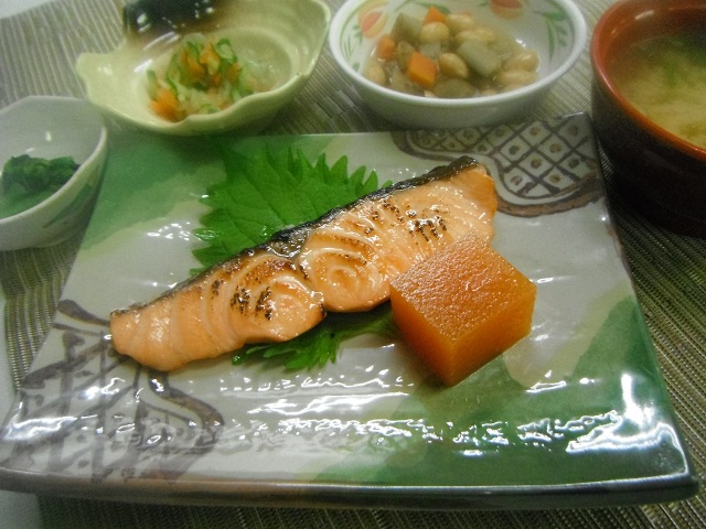 サーモンに塩麹を塗って香ばしく焼き上げました。