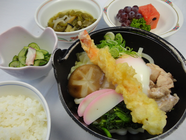 本日は【お勧めメニュー】です。暑い夏に汗をかきながら食べる「鍋焼きうどん」もまた格別でご入居者にもたいへん好評でした。