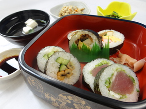 本日はお勧めメニューで、定番の厚焼き玉子、高野豆腐、干瓢の太巻き寿司に、ネギ入り鉄火巻き、穴子胡瓜巻きの「三種の太巻き寿司」を提供しました。