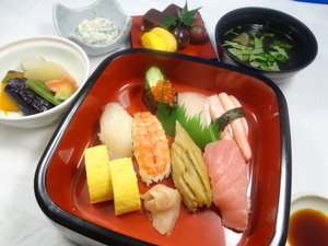 本日は二ヶ月に一度のゆうゆう御膳です。上握り寿司はトロ鮪・煮穴子・海老・鯛・イクラ・カンパチ・カニ・厚焼き卵を盛り合わせました。