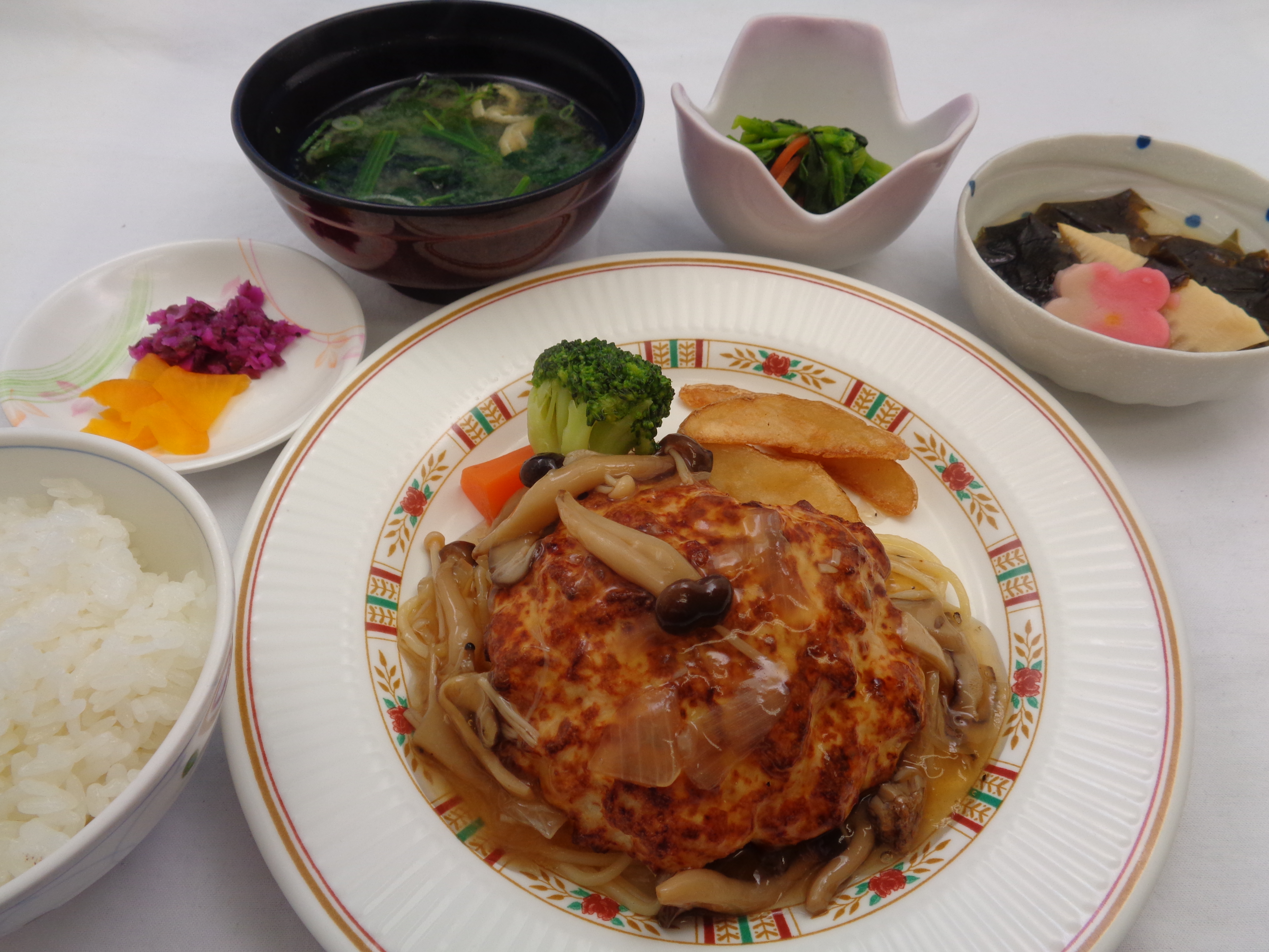 手作りの焼き立て豆腐ハンバーグに醤油ベースの茸ソースをかけてお出しします。
