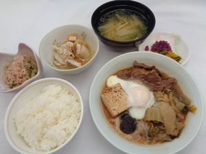 本日は、牛すき焼きです。甘辛く炊いた野菜とお肉、卵は必需品です。