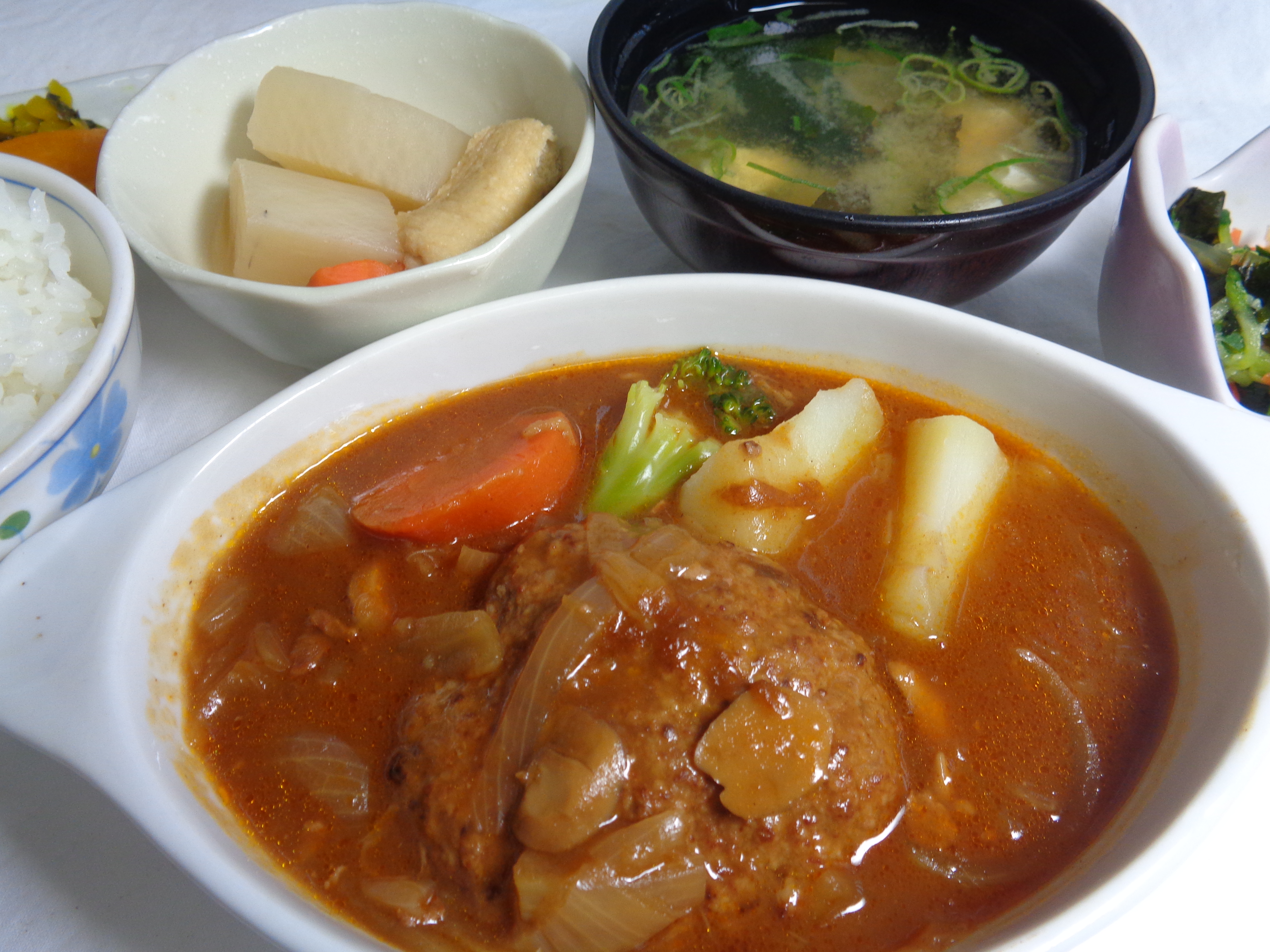 本日は、コクのあるデミグラスでハンバーグを煮込みました。