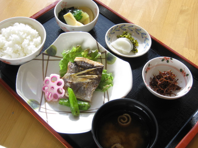 ・いとよりの煮付 ・山菜きんちゃくの煮物 ・しらすとほうれん草のお浸し ・玉葱の味噌汁 ・香の物 カロリー:535kcal 塩分:4.2g |