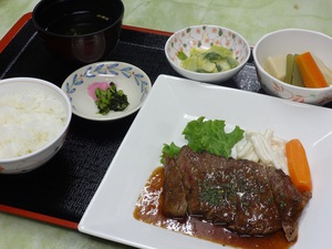 本日の夕食は,鹿児島産牛サーロインステーキです。