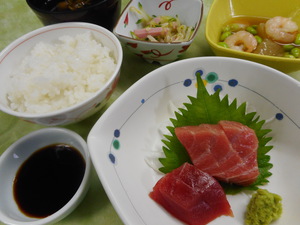 本日の夕食は、<幕の内弁当>鮪とカンパチのお造りです。