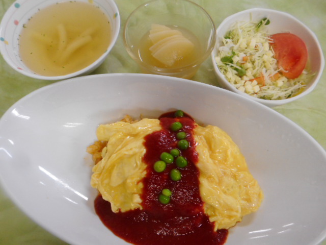 本日の昼食は、オムライスのトマトソースかけです。