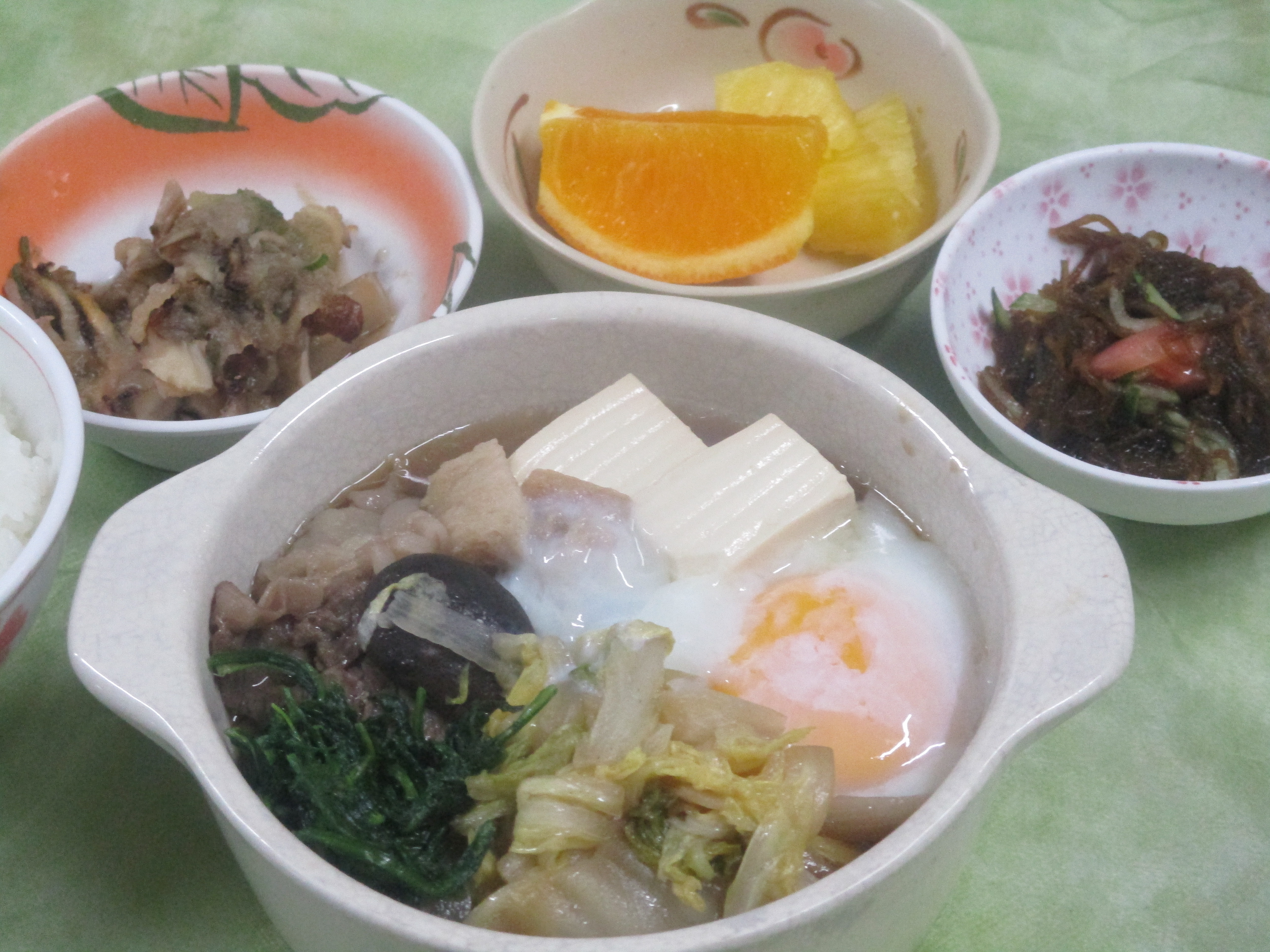 本日の夕食はすき焼き風煮温泉卵のせです。