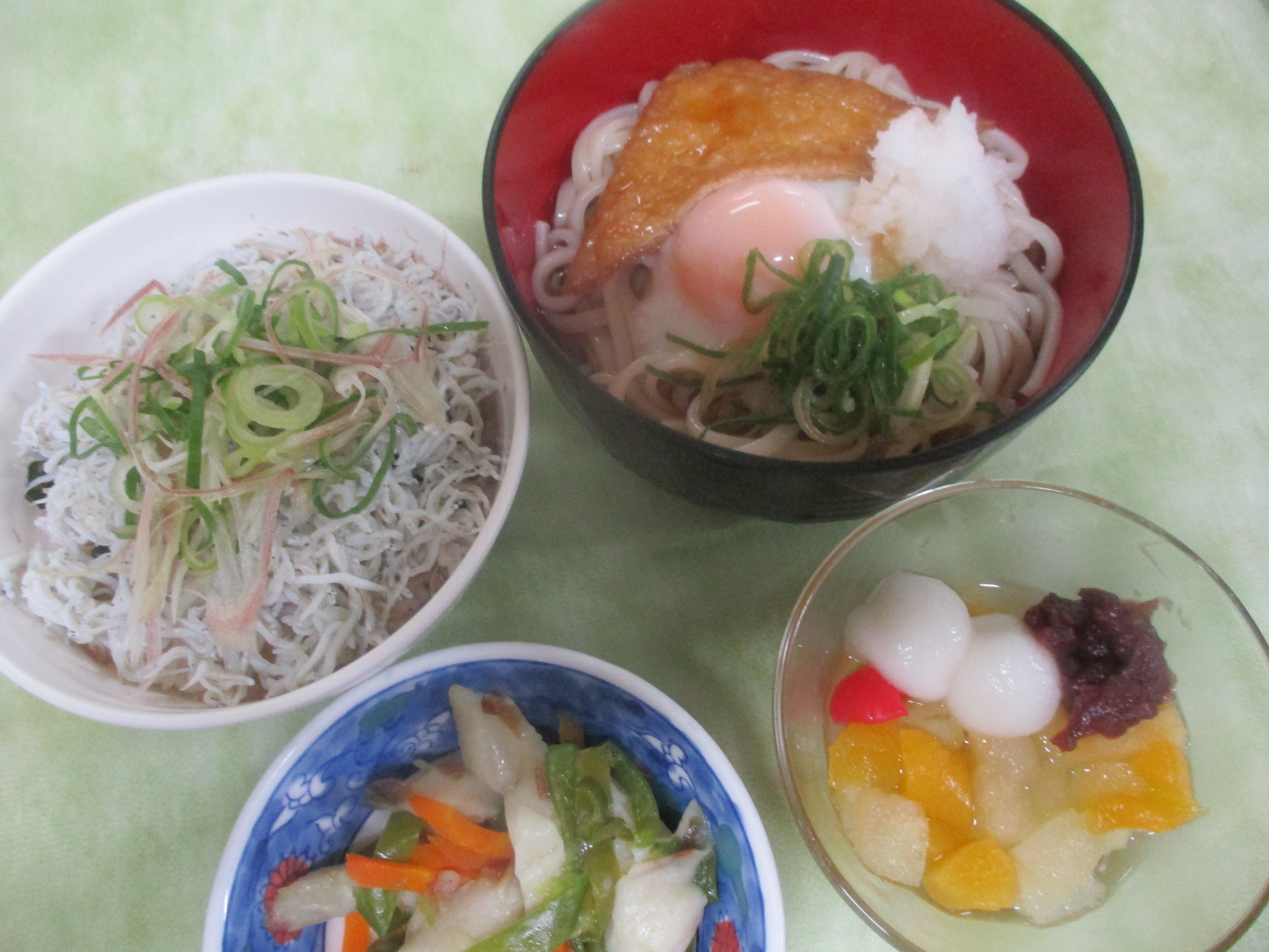 本日の夕食は、ミニ釜揚げしらす丼とミニ五目うどんです。