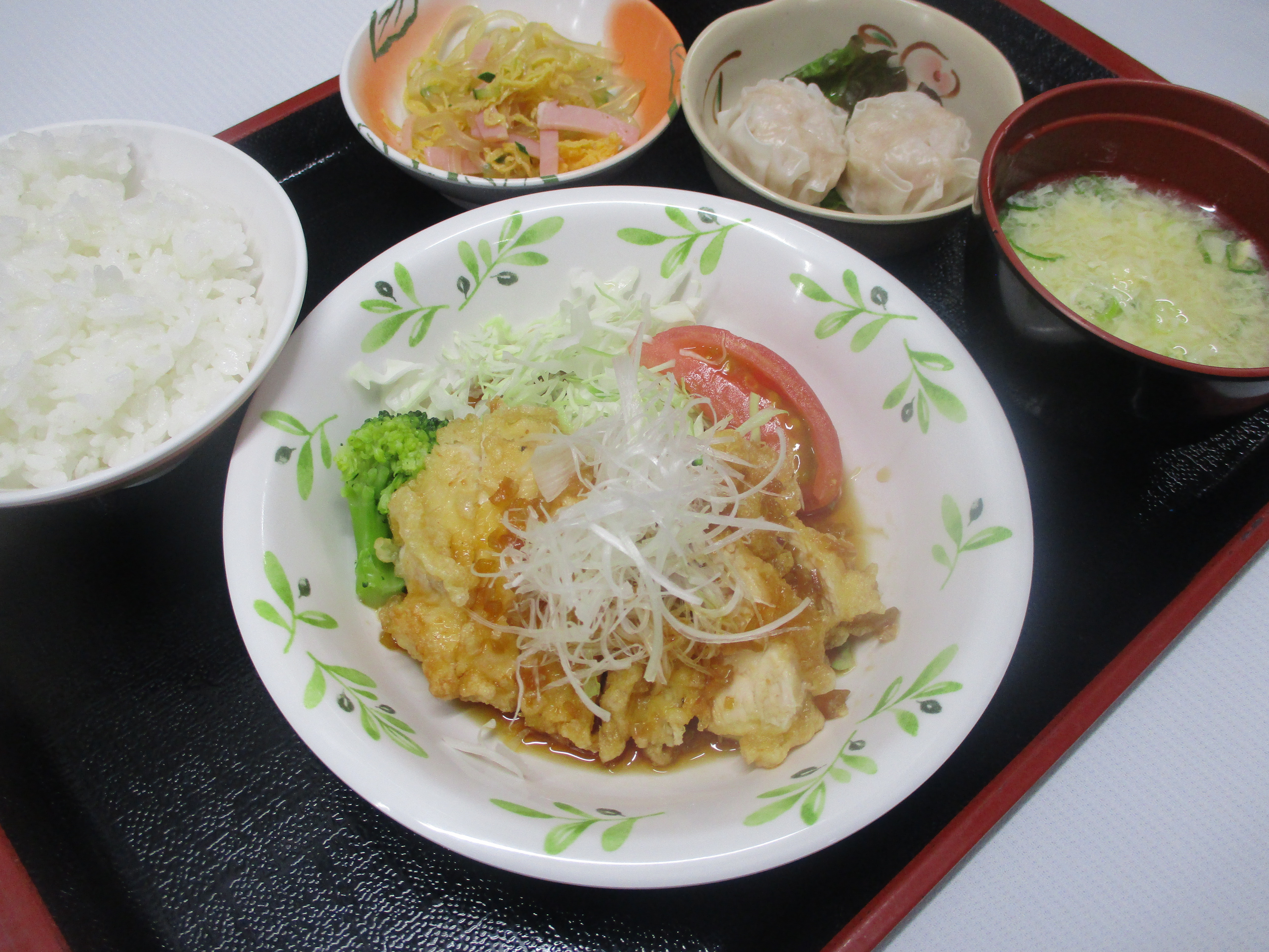 本日の昼食はジューシーに揚がった鶏肉に白ネギ・ニンニク・生姜を胡麻油で香りをだした特製のネギソースと一緒に召し上がって頂きました。