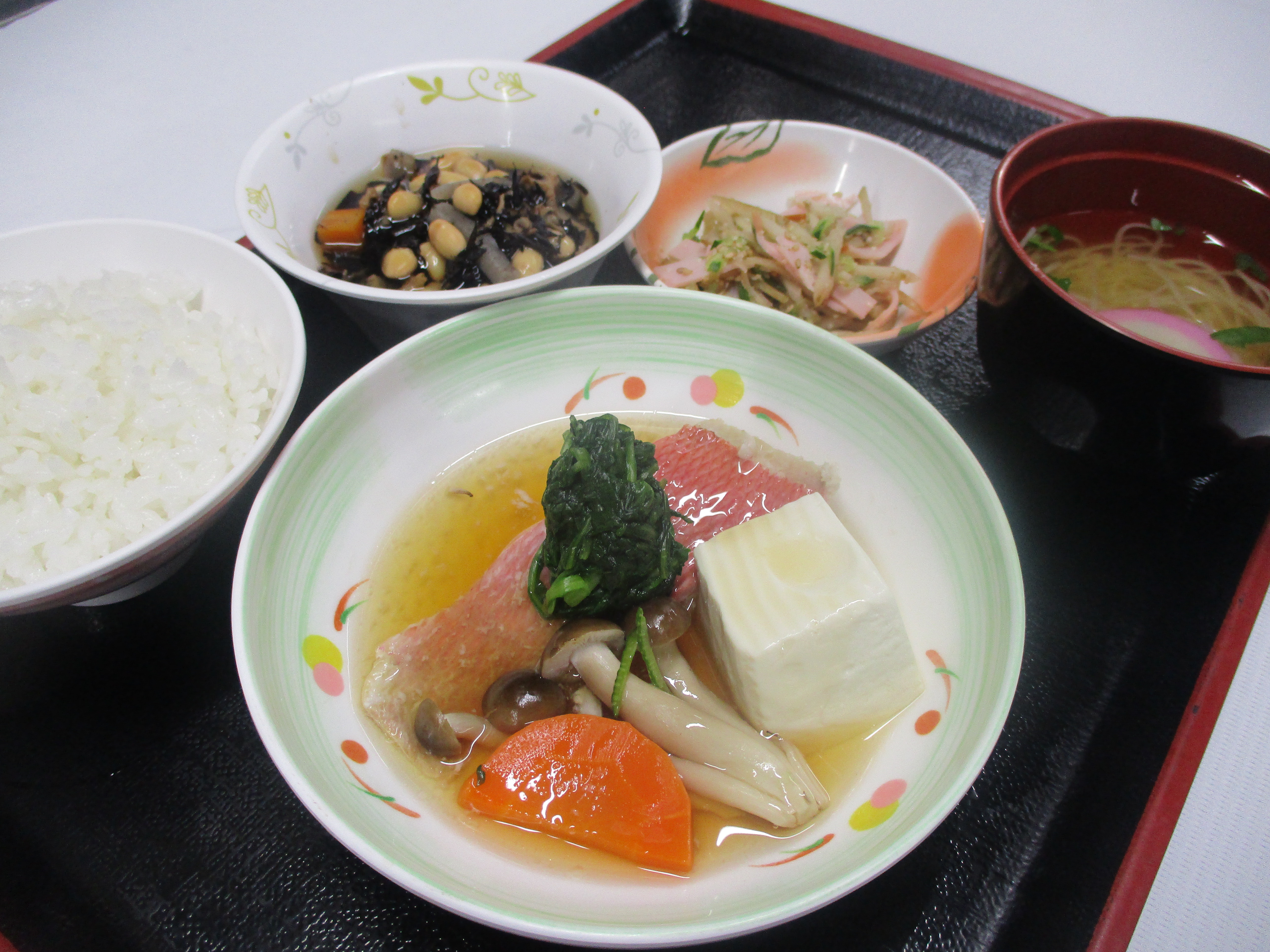 本日の夕食はふっくらとやさしい味に炊き上げた鯛の煮つけに