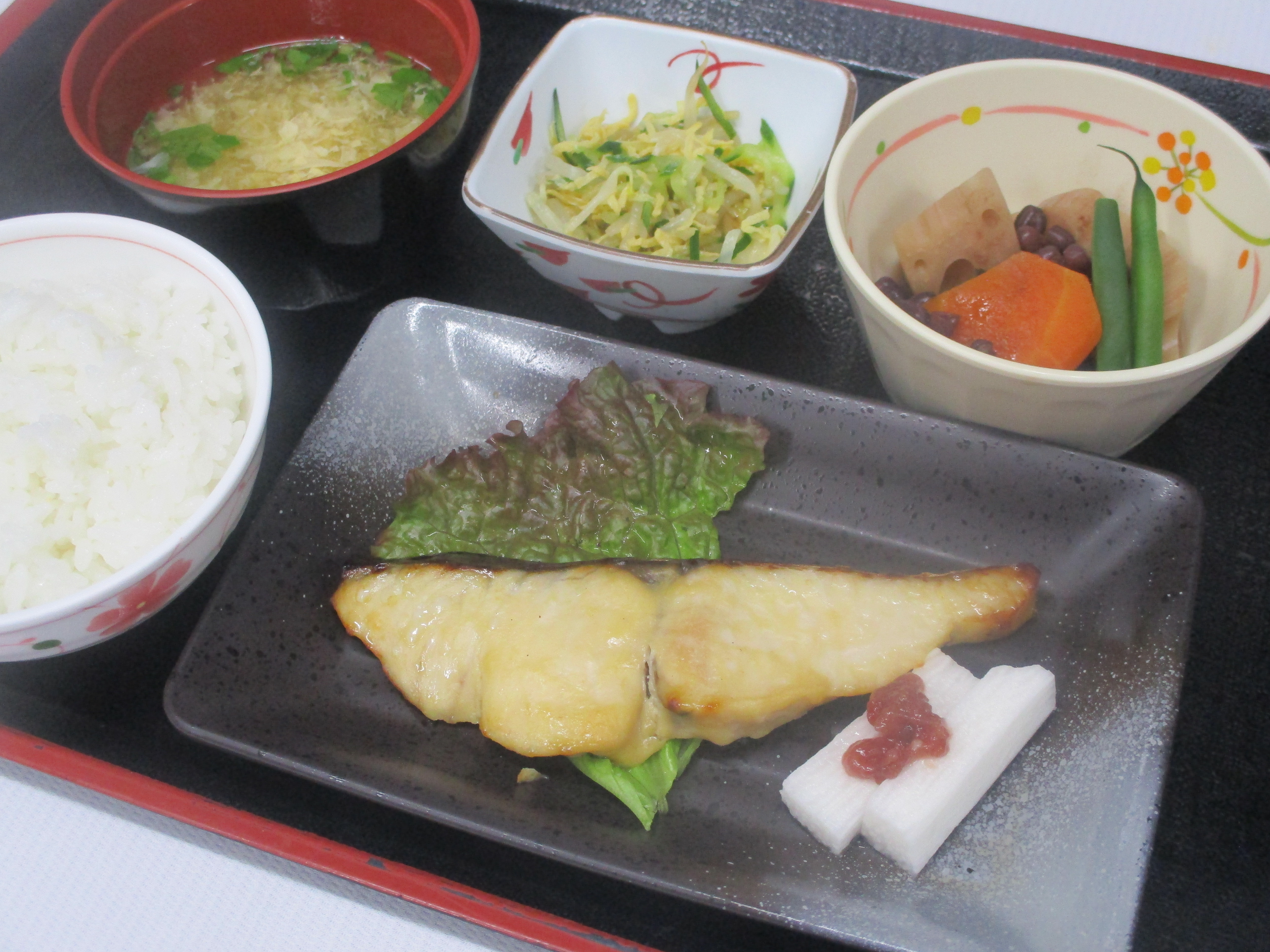本日の昼食は自家製の西京味噌に2日間漬け込みこんがりと焼きあげた鰆の西京焼きです。