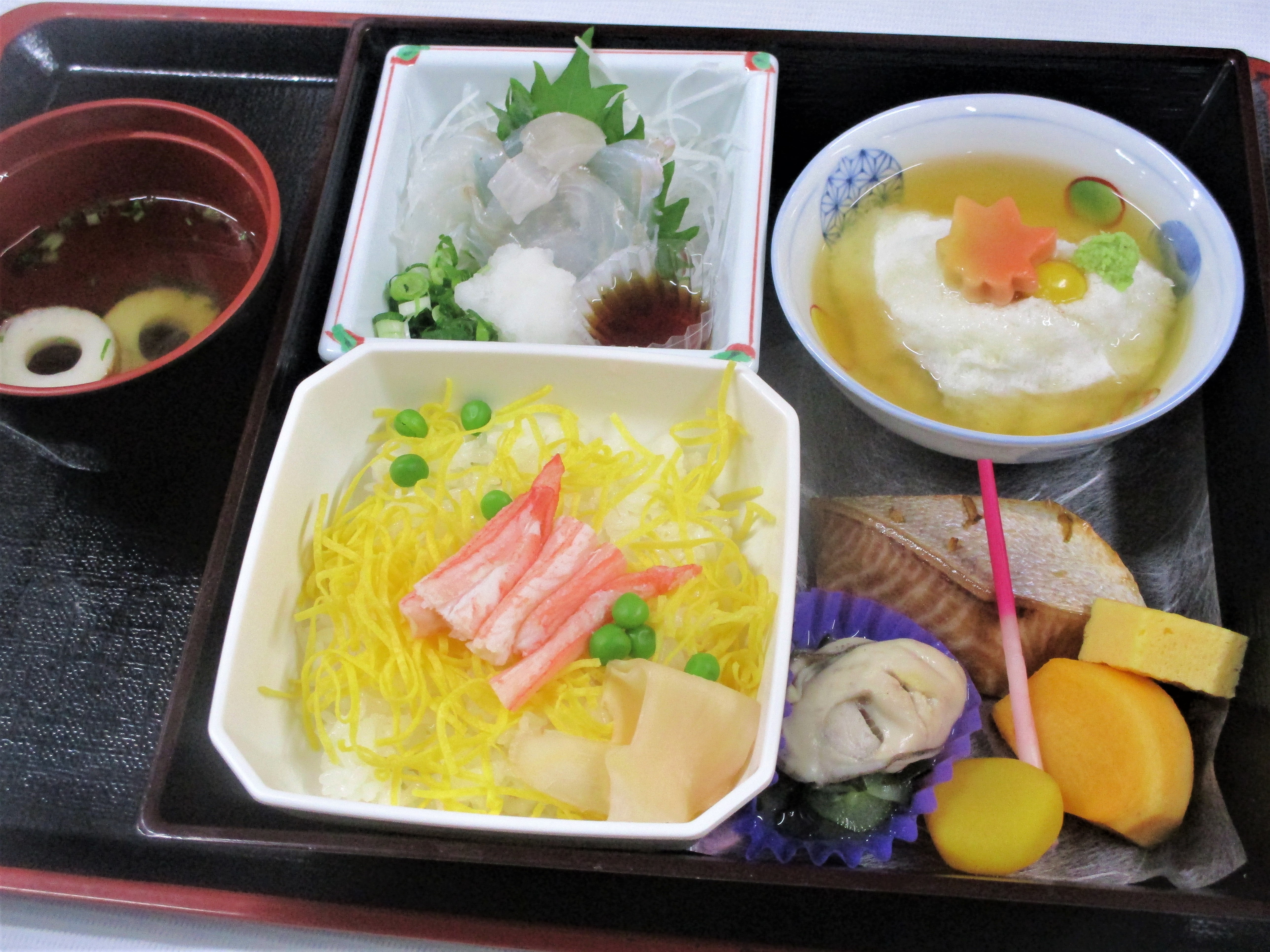 本日の特別食は鯛・勘八・鰹のお刺身3種盛り合わせを召し上がっていただきました。