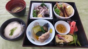 本日の選択食は寒ブリのお造り・フグのから揚げ・炊き合わせ・野菜マリネスモークサーモン添え・国産牛ロースしゃぶ野菜添え・抹茶わらび餅とフルーツ盛りをお弁当にして召し上がって頂きました。