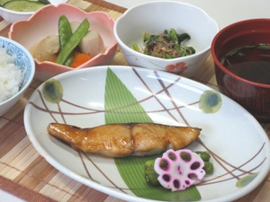 ・鰆の漬け焼き 出し巻き玉子 菜の花 花蓮根