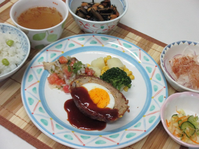 合挽き肉にじゃが芋、人参、コーン、グリンピースと混ぜ焼き上げたミートローフです。