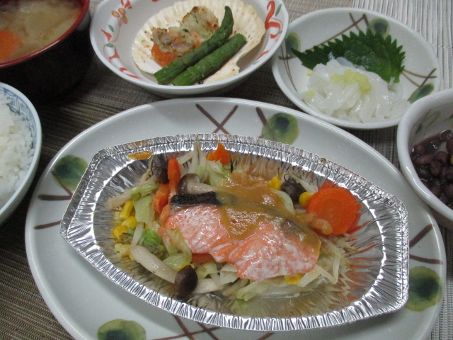 本日の夕食は、鮭を切りつけてから塩こうじに四時間ほど漬け焼き上げました。