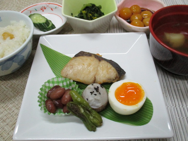 本日の夕食は、胡麻味噌で炊いた鯖の煮物や長芋の和え物、玄米、