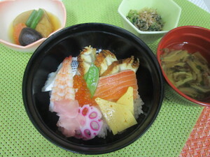 本日の夕食は、鰻と海鮮のちらし寿司です。鰻・サーモン・海老・小肌・イクラを彩りよく盛り付けました。吸い物には、茸を入れ秋らしい味わいにしました。