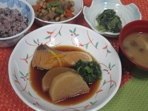 脂ののったブリは美味しいだけでなく、悪玉コレステロールを下げる、DHAやEPAが豊富に含まれています。本日の夕食は、御飯に黒米、煮物に大豆、和え物に胡麻、汁物に茸など全ての料理に悪玉コレステロールを下げる食材をつかった献立です。