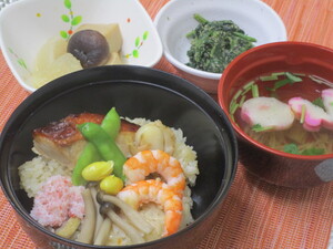 本日の昼食は、炒り卵、鶏肉のそぼろを敷き詰め、