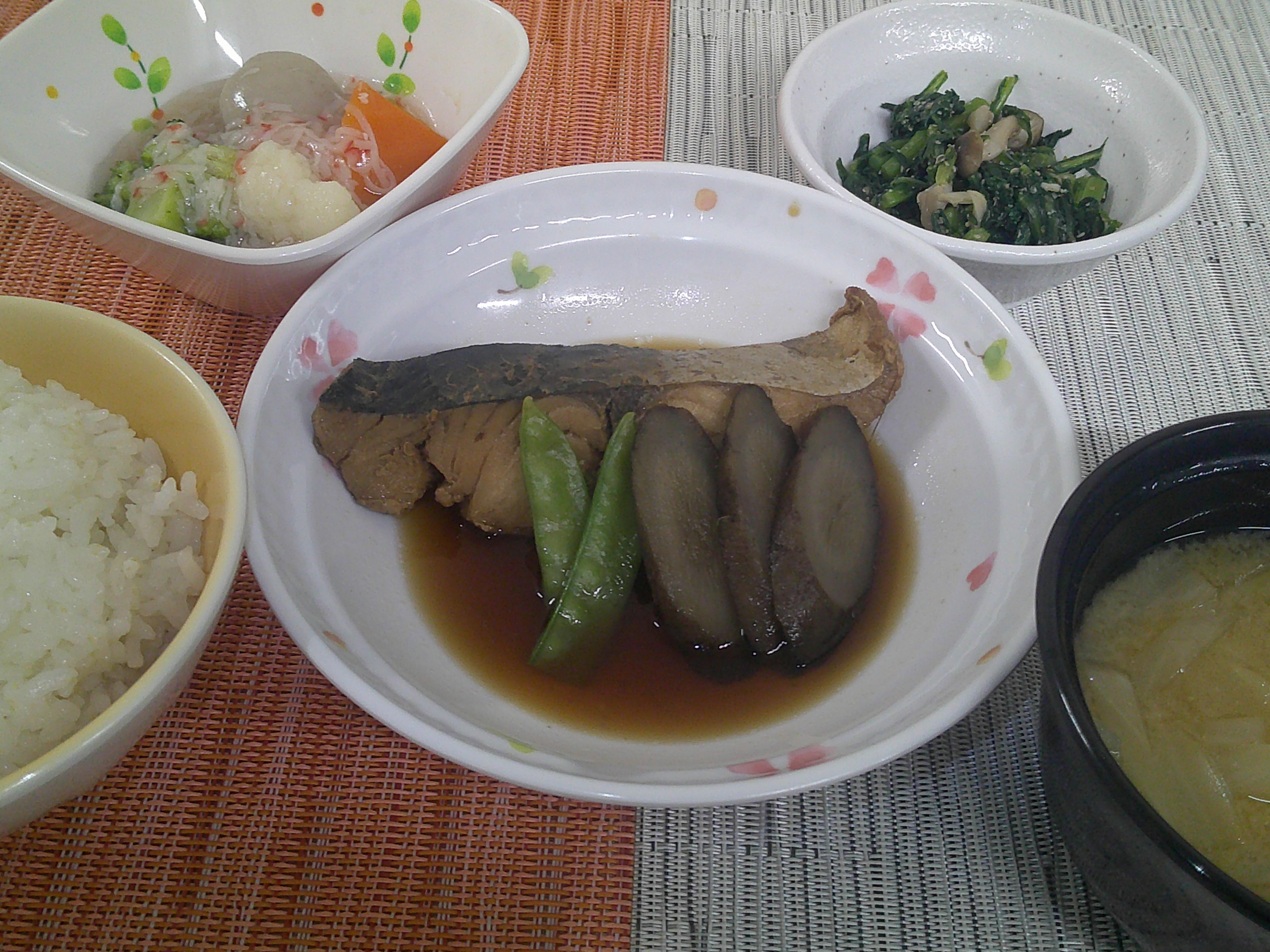 本日の夕食は、柔らかくにた鰆にごぼうと絹さやを盛り付けた、煮つけをご提供いたしました。