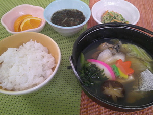 本日の朝食は吸物汁のお雑煮と祝い盛りです。