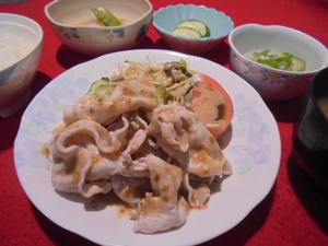 豚を柔らかく茹で上げて、自家製の胡麻ダレをかけてさっぱりサラダ感覚に仕上げました。